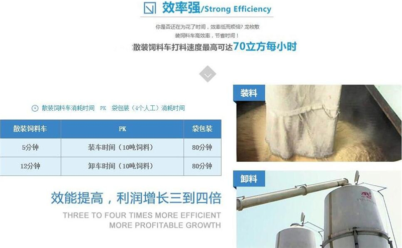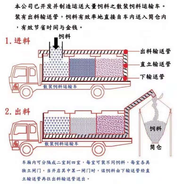 散裝飼料車的優(yōu)勢(shì): 散裝飼料的生產(chǎn)可實(shí)現(xiàn)直接生產(chǎn)直接裝車,隨產(chǎn)隨出,不需要進(jìn)行提前備貨,不占用倉(cāng)儲(chǔ)設(shè)施,也不會(huì)出現(xiàn)停產(chǎn)等待拉料的現(xiàn)象,使飼料生產(chǎn)實(shí)現(xiàn)計(jì)劃管理,生產(chǎn)效率得到提升。 ★獨(dú)有倒梯形設(shè)計(jì),散裝飼料在罐體內(nèi)密封輸送,V字形罐體卸料順暢,減少飼料的耗損,保證質(zhì)量,避免污染。 ★運(yùn)輸比包裝成袋運(yùn)輸不但節(jié)省勞動(dòng)力,而且成本較低。 ★可選電動(dòng)卸料、全液壓卸料、氣卸為全自動(dòng)上料卸料,可連續(xù)作業(yè),大大提高生產(chǎn)效率。 ★罐體內(nèi)可加裝分倉(cāng),可同時(shí)運(yùn)輸多種不同類的飼料或膨人介質(zhì)。部件標(biāo)準(zhǔn)化,容易維修保養(yǎng)。 頂部進(jìn)料倉(cāng)