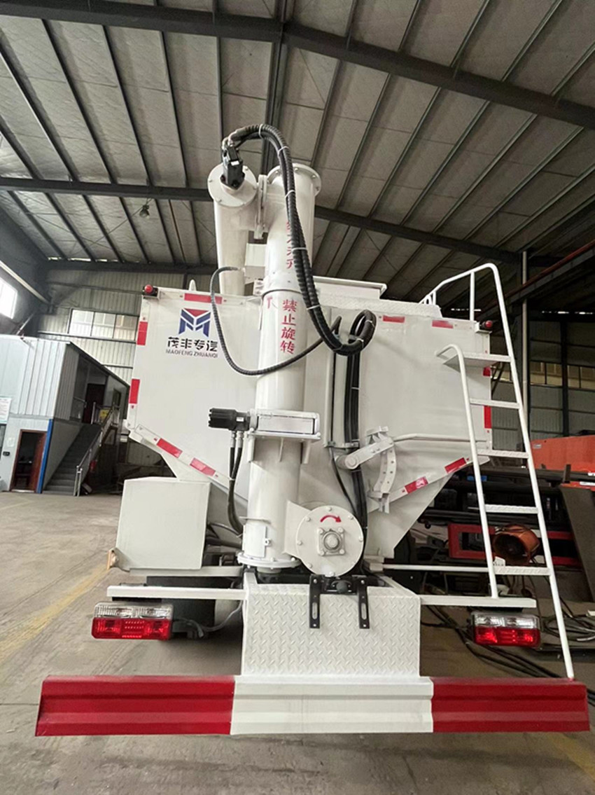 散裝飼料運(yùn)輸車(chē),散裝飼料車(chē)的飼料罐架設(shè)在卡車(chē)的底盤(pán)上,罐頂開(kāi)有進(jìn)料口.頂部的一根螺旋輸送卸料管(俗稱(chēng)卸料絞龍)則可自由回轉(zhuǎn)和抬升,抬升的仰角可達(dá)60度。運(yùn)輸時(shí),頂部的螺旋管平臥在罐頂;卸料時(shí)則抬起,使管端的出料口與畜禽飼養(yǎng)場(chǎng)貯料罐頂部的進(jìn)料門(mén)相接,駕駛室內(nèi)裝有操縱裝置(操縱裝置也可裝置在罐體尾部),卸料時(shí)通過(guò)車(chē)底的動(dòng)力輸出軸和減速器來(lái)驅(qū)動(dòng)螺旋,以完成卸料。